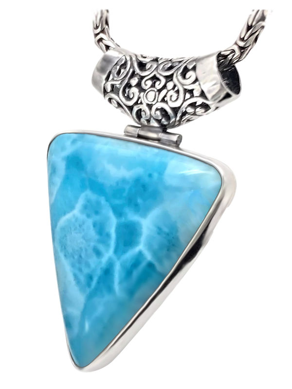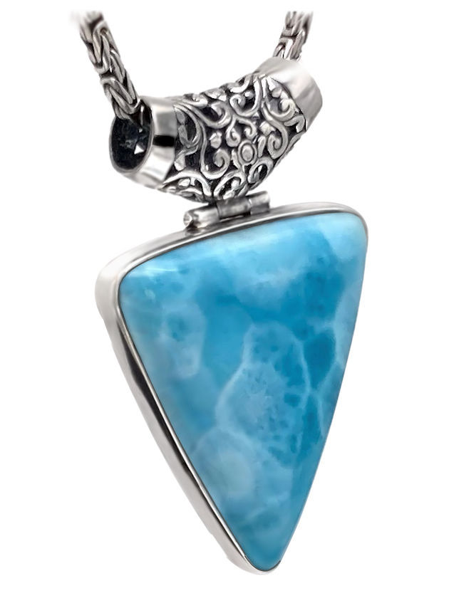 A collector’s dream—this bold triangular Larimar pendant is a breathtaking showcase of volcanic blue beauty. Expertly carved and set in a high-polished sterling silver bezel, the stone is accented by an intricately scrolled oversized bail for a refined, elevated finish.